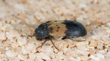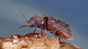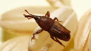 Sitophilus oryzae is only 3 mm long, but it can cause quite a lot of damage despite its small size. The blackish-brown rice weevil, which was inadvertently introduced from the tropics, can be identified by the four square-shaped orange markings on its wing cases.
